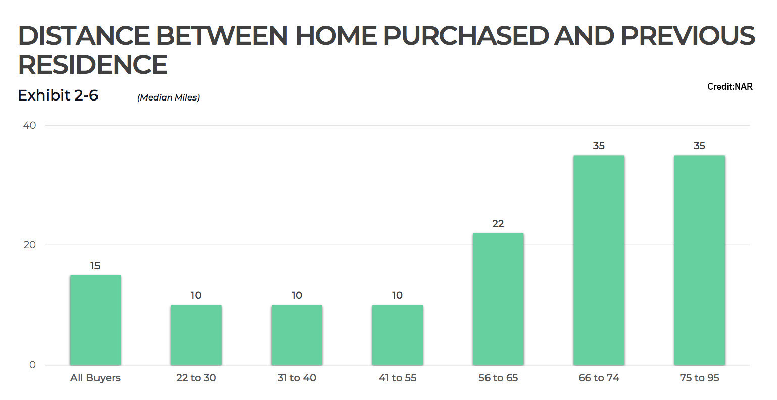 The 2021 survey from NAR further bears this out. It shows that for buyers between the ages of 31 and 40, the median number of miles between their prior residence and their new home was just 10. By comparison, for younger baby boomers the median was 22 miles and for older boomers it was 35.